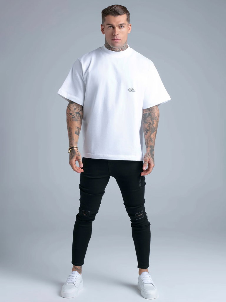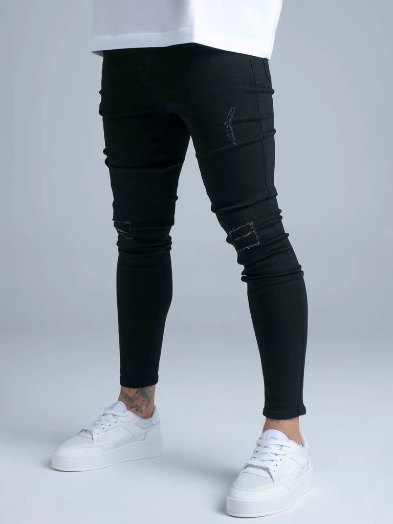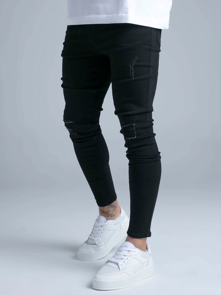 Svarta jeans från Sik Silk med lagningar och hål. Stretch i materialet. Bomull med fokus på hållbarhet. Skinny fit med ganska rymlig gren. Tajta storlekar. (182cm/85kg strl M)