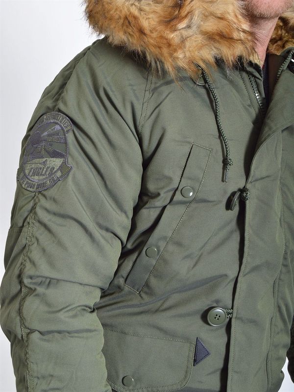 Grön vinterjacka från Alpha Industries. Snygg, detaljrik och välsydd i tåligt material. En snygg, praktisk och varmfodrad jacka. Avtagbar fuskpäls på luvan. Justerbar midja och luva. Normala storlekar. Värme 4,5/5. (187cm/85kg och strl L)