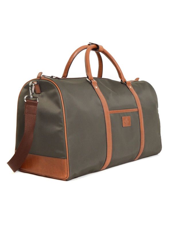 Läcker weekend bag från svenska Saddler. Tillverkad i grönt nylon och brunt äkta läder av hög kvalitet. Tre fickor invändigt varav en med dragkedja samt en ficka på utsidan. Justerbart och avtagbart axelband. Bredd 26cm, höjd 31cm, längd 51cm.