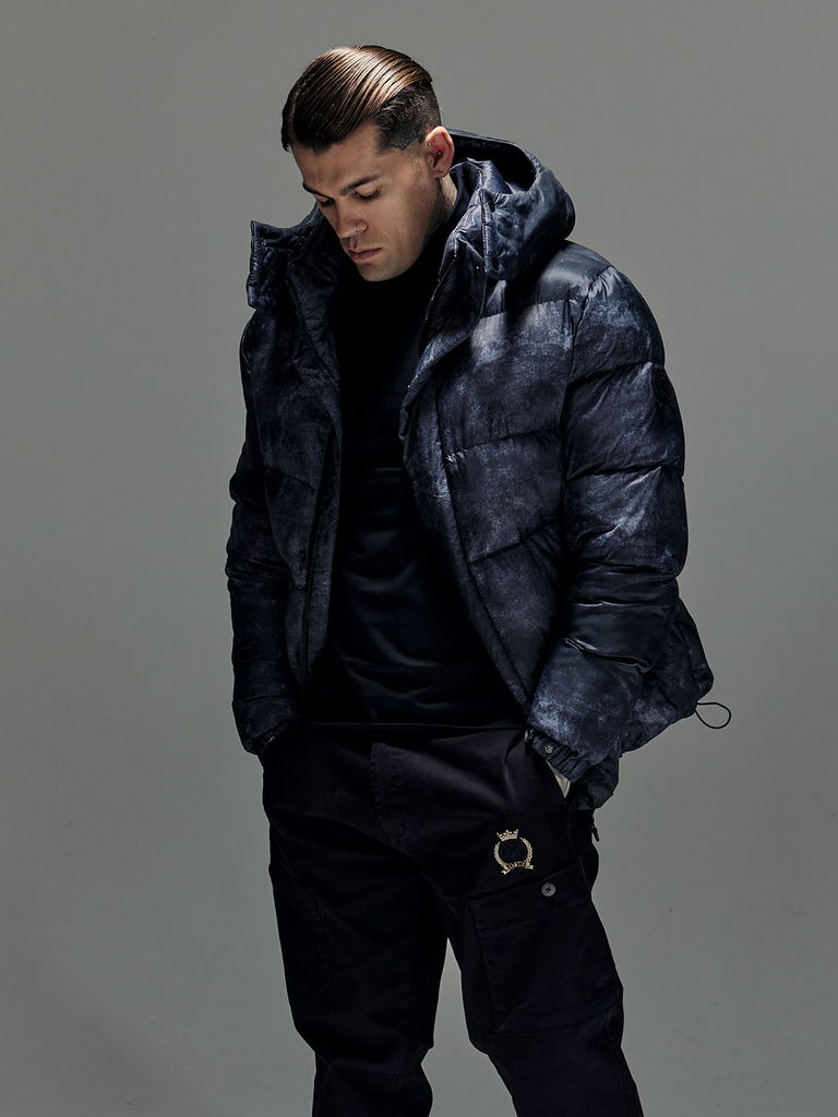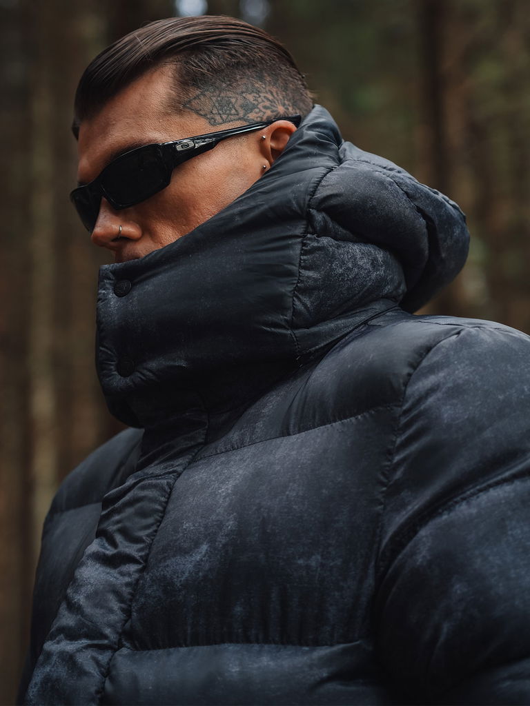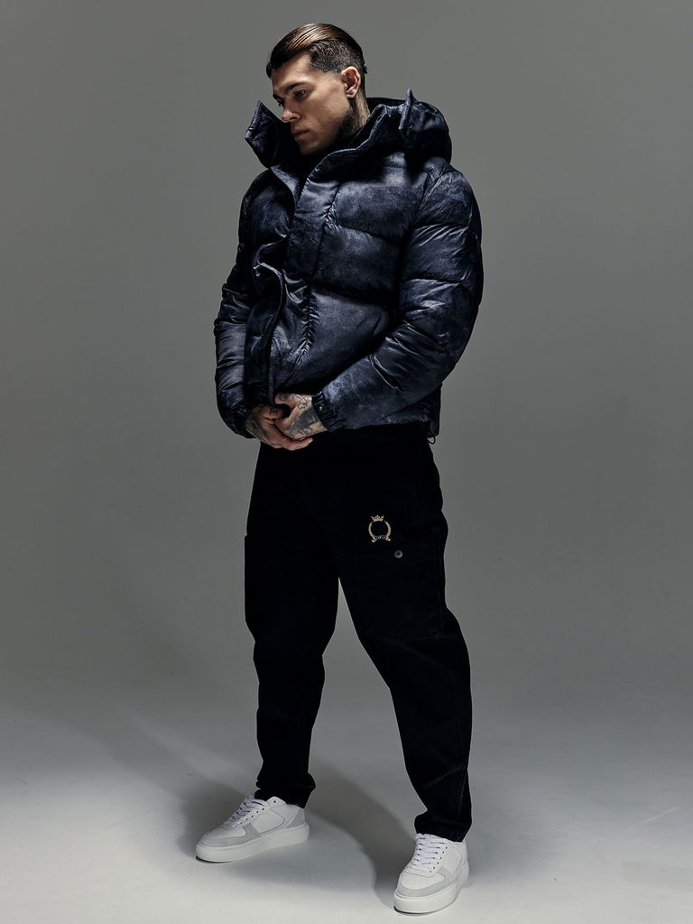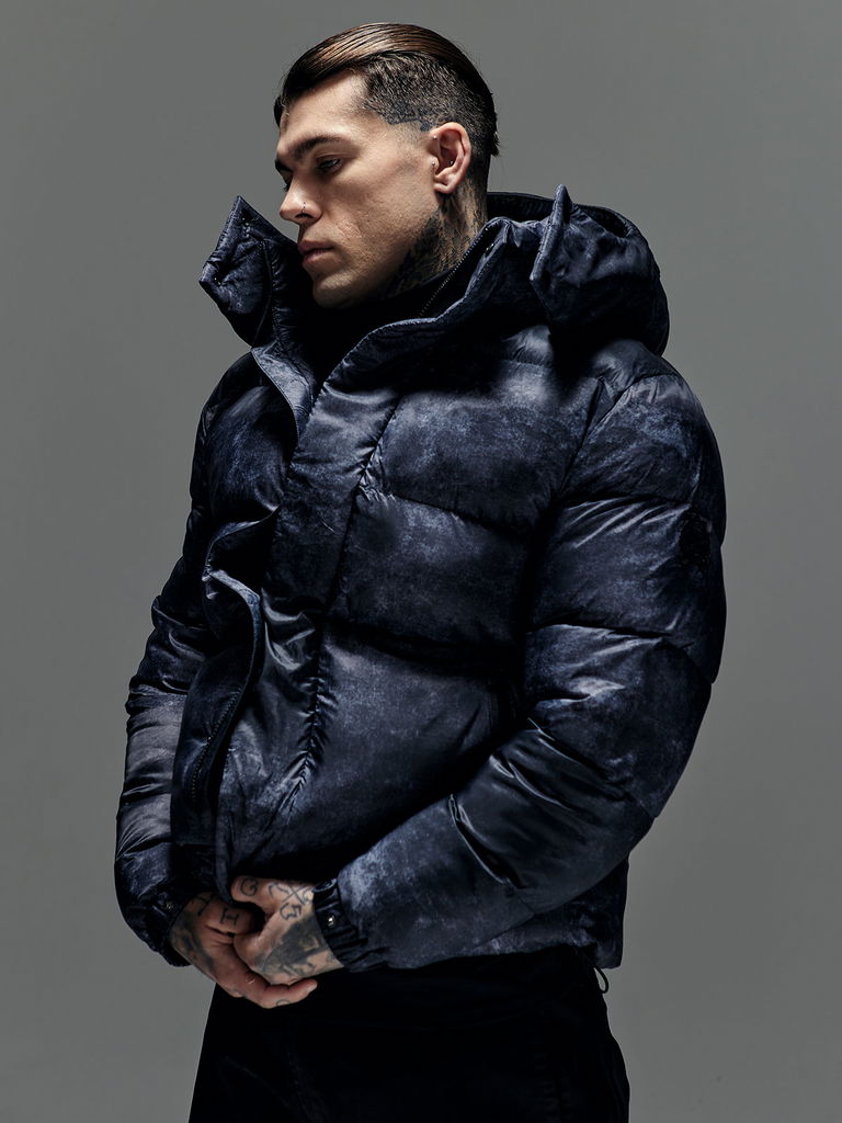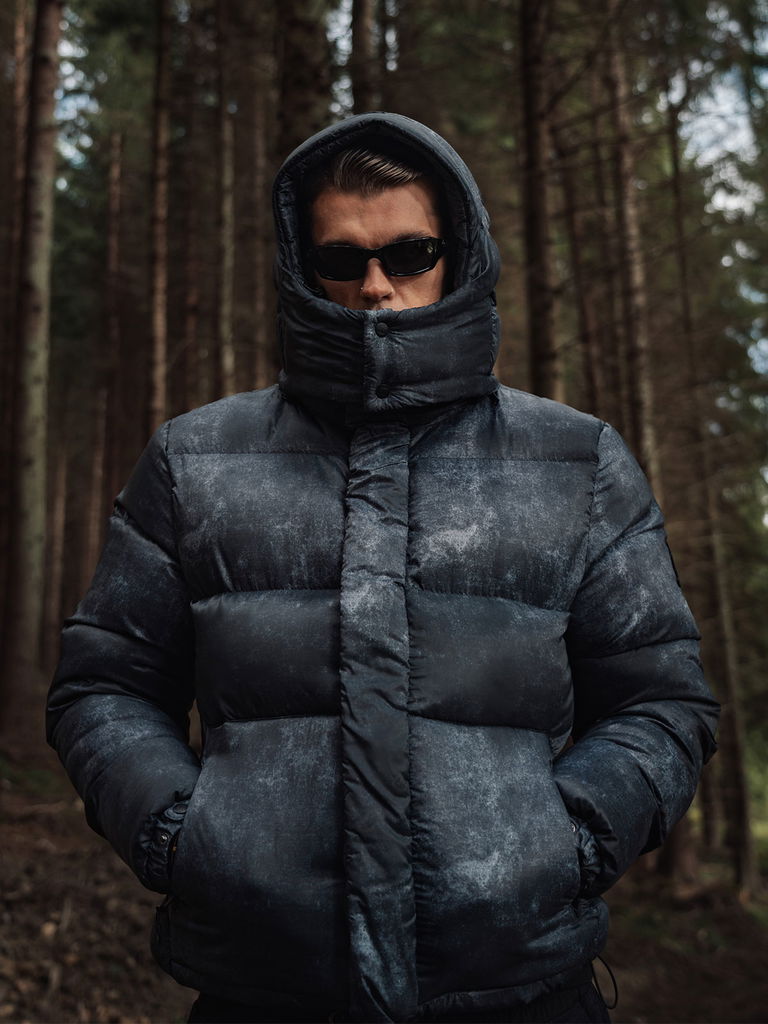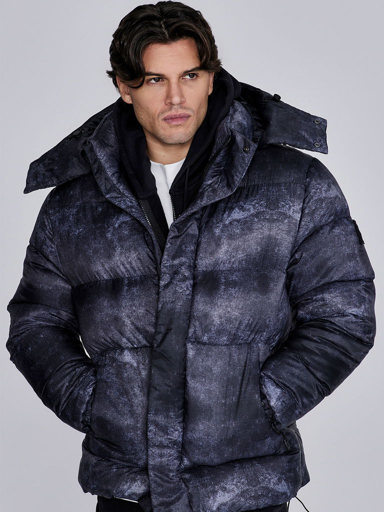 Grå pufferjacka från Sik Silk med marmorering i färgen. Avtagbar luva. (Modellen är 184cm/84kg och bär strl M) Värme 4/5. Stora storlekar.