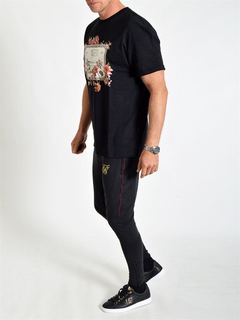 Svart t-shirt från Criminal Damage. Stort tryck fram av en vinetikett och blommor. Oversize i modellen.